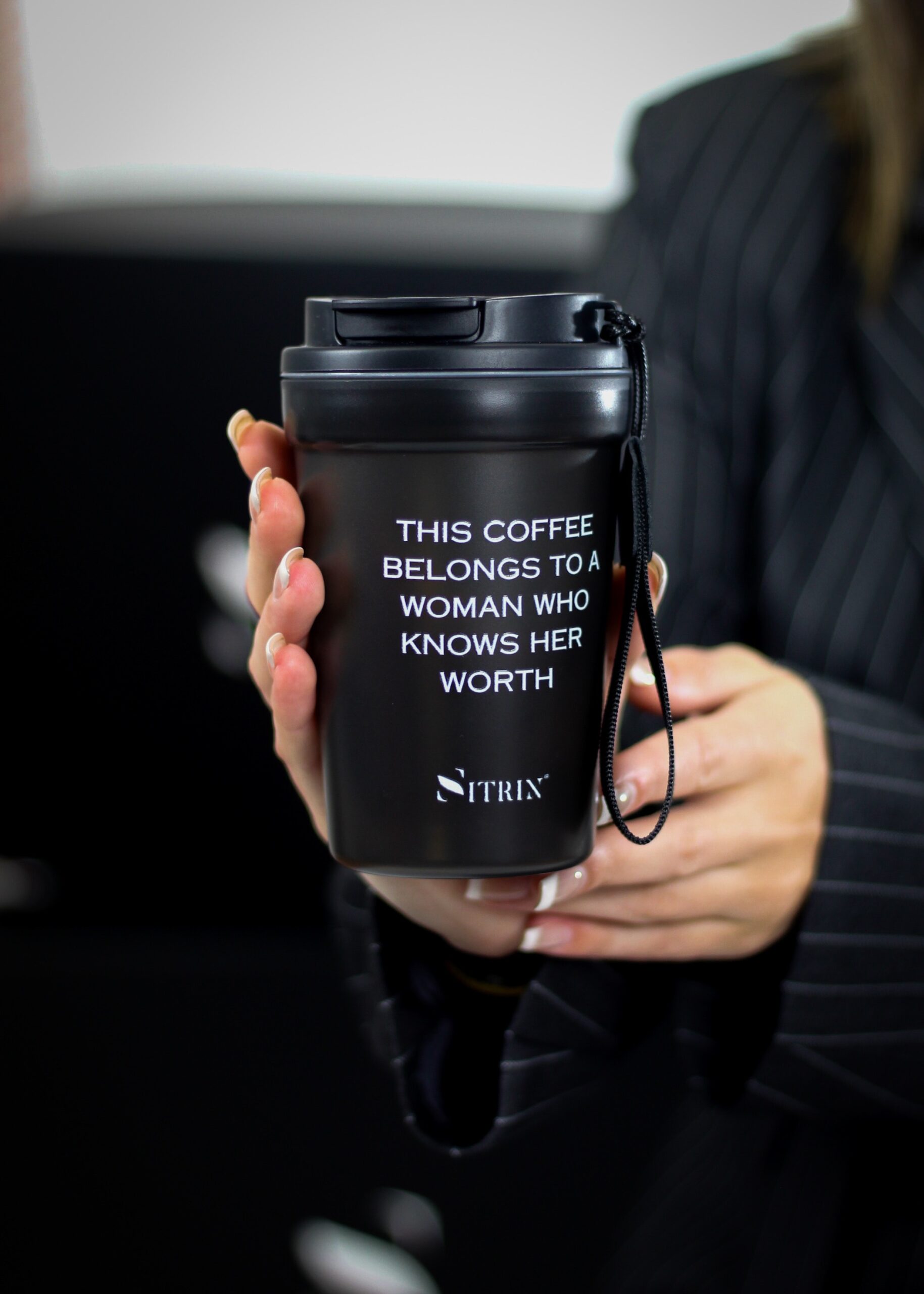 A frase “This coffee belongs to a woman who knows her worth” não é apenas um detalhe, é a identidade do copo, um reforço diário de autoestima, ambição e confiança.